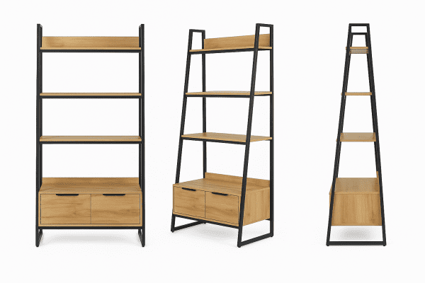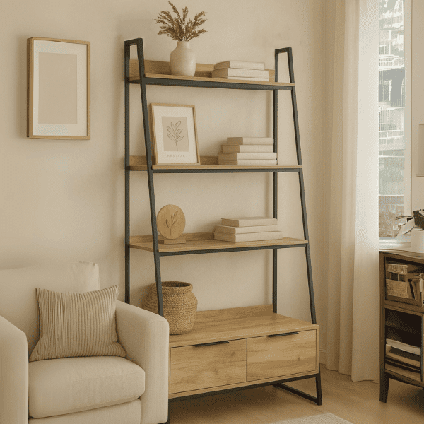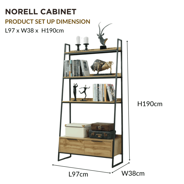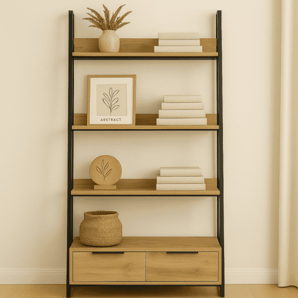 Elevate your living space with the Norell 4-Tier Multipurpose Shelf Cabinet Rack, where contemporary industrial design meets everyday practicality. With its open shelving framed in black metal and natural oak-finished panels, it brings warmth, structure, and versatility to any room. Perfect for displaying décor, books, or personal collections while keeping essentials neatly tucked away in the lower drawers, this piece balances function and style effortlessly.