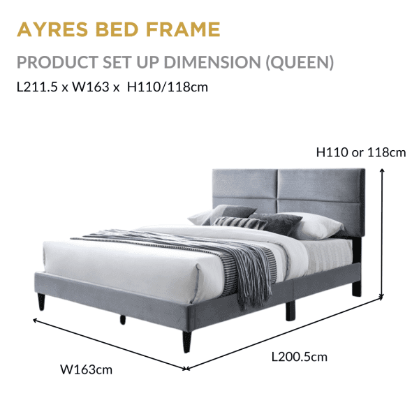 Looking for a Queen Bed Frame in Malaysia that blends modern comfort with timeless style? The Ayres Bed Frame by Luxe Living offers refined aesthetics and adjustable practicality. Upholstered in luxurious velvet silver, it features a dual-height adjustable headboard — 110cm for 10-inch mattresses or 118cm for thicker ones. For 8-inch mattresses, Luxe Living offers customised headboard adjustments upon request.